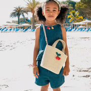 This super sweet basket bag made with woven raffia and has acrocheted cherry embellishment. It is fully lined with a matching cherry print and features both carry handles and a removable, adjustable gold strap - so little ones can choose how to carry this cheerful bag.