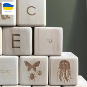 - Each block features four engraved sides showing an illustration, an uppercase letter, a lowercase letter and a word matching the alphabet letter they represent (not necessarily the first letter in a word) - with two plain sides: top and bottom.