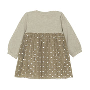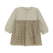Elevate your special occasion wardrobe with this Minymo Organic Tulle Dress in Beige Melange. Made with organic materials, this dress looks beautiful with its metallic heart detailing and supports sustainable fashion. Perfect for a festive and eco-friendly look.