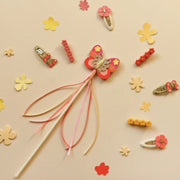 Flutter like a butterfly with these bright and bold butterfly clips, with hues of pink faux leather and shimmering gold details, secured upon gold grosgrain ribbon-wrapped snap clips. Perfect for creating magical moments!