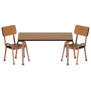 Table and chair set that fits the Mouse Hole Farmhouse.. It is made of beech wood with metal legs. Please notice the handmade colour details on the feet of the legs - both on the table and the chairs. The set comes with two chairs.