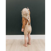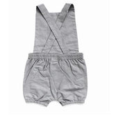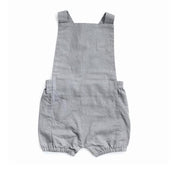 This classic style Beba Bean Vintage Linen Romper has a squared off neckline and a cross back detail including adjustable buttons at waistline for sizing. Bottom snaps for easy diaper changes.