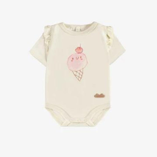 Souris MiniCream bodysuit in organic cotton jersey, ideal for sensitive skin. It has short sleeves, a round neck, and an illustration with cheerful ice cream....
