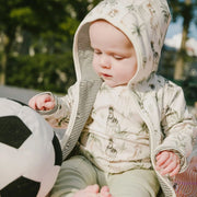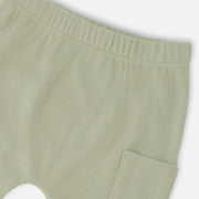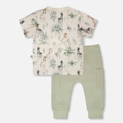 With its wild safari flair, the organic cotton jersey t-shirt and cotton rib pants set zebra jungle print and sage green is made for adventurous little boys. The short-sleeve top features shoulder snaps and an allover print of zebras among tropical palms. The ribbed pants complete the look with a sage green finish, elastic waistband, cuffed ankles, and roomy side patch pockets. Made from breathable organic cotton jersey and soft cotton rib, this set is playful, comfortable, and ready for every summer outing.