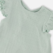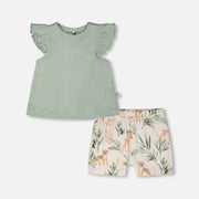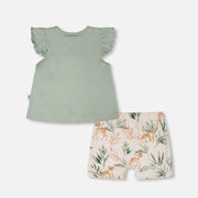 The organic cotton pointelle top and jersey short set leopard jungle print is a sweet essential for sunny days. The delicate green top with flutter sleeves and buttons on the shoulder pairs perfectly with our soft peach shorts adorned with allover playful deer and leafy accents. The top is crafted in breathable pointelle with a hint of stretch, while the shorts are made from organic cotton jersey for softness and comfort. Perfect for warm-weather strolls and playtime, this outfit blends elegance and lightness.