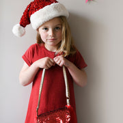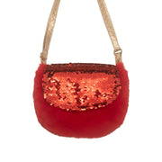 This shimmer sequin velvet bag is the perfect party bag for the festive season! Made with soft faux fur, it features a red sequin flap and a shimmery gold strap. It is fully lined with velvet, with a magnetic dot closure and an adjustable strap with a breakpoint for safety.