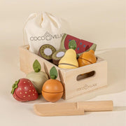 - This set includes: 1 kiwi, 1 strawberry, 1 watermelon, 1 pear, 1 lemon, 1 apple, 1 orange, wooden crate, knife with a cloth bag for storage.
