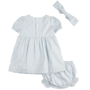 This Celestial Blue Yarn-Dyed Striped Woven Dress is a 3-piece dress set in Petit Lem's adorable occasion-wear collection. Made from a light, breathable striped poplin, the set features a sweet party dress, diaper bloomers, and a matching headband. The dress has a bow along the waistband and elasticated sleeves for a slightly puffy finish. A button at the back makes dressing over the head easier. The bloomers provide a snug fit over their diaper to keep it in place, and they’re finished with a frilly trim along each leg. The headband is gently elasticated with a bow on the front to keep them looking and feeling their best, no matter the occasion.