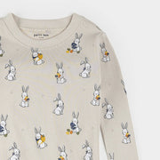 These Egg Hunt print PJs match the sleeper from the same range, allowing little bunnies of all sizes to feel cozy and comfortable while hunting for eggs or munching on their findings. The long-sleeved PJs have a rounded neckline and ribbed cuffs for easy over-the-head dressing before another exciting day. Elastic in the waistband makes the pants easy to pull up and down, while the ribbed ankles provide a snug fit. Made from organically grown cotton rib, the set is light, breathable, warm and snuggly for the transitional season.