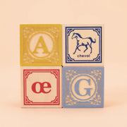Expand your knowledge of France with Uncle Goose French Language Blocks. Enjoy the embossed fleur-de-lis filigree. This stylized detail surrounds two capital letters on opposing sides of each block. Two other sides show one number and one animal paired with their French translations. Two more hand-crafted letters make four complete alphabets.