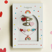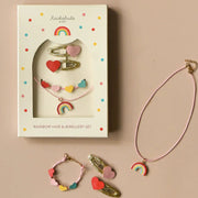 This vintage rainbow hair and jewellery gift box makes the perfect present! The set includes two sweet love hearts on gold ribbon-wrapped clips, a bright rainbow necklace and a colourful heart bracelet. Each set is beautifully presented in a gift box that is the perfect size for letterbox gifting!