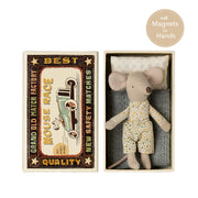 Elevate your storytelling with this classic Maileg Little Brother Mouse in box with an adorable dots outfit! Soft fabrics and magnet hands provide endless hours of imaginative play. A must-have addition to your collection, make sure to enhance your playtime with adorable accessories.