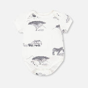 Contrasting patterns add bold style to deux par deux Organic Cotton Onesie and Shortall Set Sand Stripe. The onesie offers an ultra-comfortable fit with short sleeves, a crew neckline, bottom snaps, and an allover jungle print. The shortall features a contrasting striped pattern with button straps, a scoop neckline, and a kangaroo pocket.