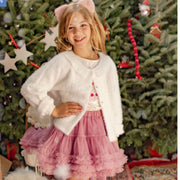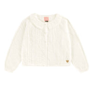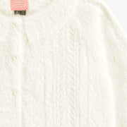 This fluffy white cardigan is irresistibly soft and charming. It features three pearl buttons that create a flared silhouette, a Peter Pan collar, and delicate pointelle details for an adorable and feminine look. The ribbed knit cuffs ensure a snug fit.