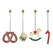 Maileg Metal Ornament Set, Peter's Christmas is a perfect gift box containing four beautiful Maileg ornaments. Each ornament is wrapped in tissue paper and packed in a gift box decorated with Dorte Mailil's drawings. Peter's Christmas set contains a drum, sugarcane, pretzel and a rocking horse.