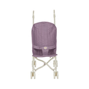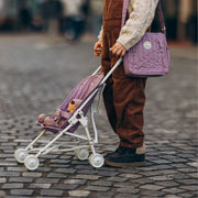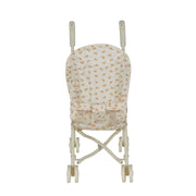 - Quilted cotton stroller seat with metal foldable stroller frame, comes in a drawstring shoulder bag