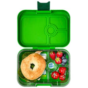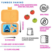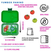 Yumbox Panino is the same compact size but holds more food for growing kids and adults. It’s perfect for school, work and weight-conscious lunches. Prepare balanced healthy meals in minutes!4-compartment food tray (illustrated) - Yumbox is a kid-friendly, bento-style container that fits easily into YumboxPoche or Classic Lunch Bag. The Yumbox is made out of two pieces, an exterior box and a tray insert that fit together to provide a LEAKPROOF solution for wet foods like yogurt, and applesauce (not water). Pack wet foods like yogurt and dips (not water). Purchase an extra tray for more variety