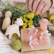 Let’s begin this journey by welcoming the blooming life of Spring with the first seasonal box: Hello Spring with Ostheimer Lamb. The box contains 5 Spring themed pieces: 2 Tuplip mandalas, 1 Nin, 1 Press (w/ papers and rubber band) and 1 Miniature Lamb.