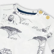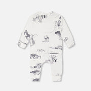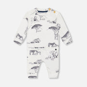 Whether he/she's calm and relaxed or acting a bit wild, this set makes every moment a bit more memorable! The Organic Cotton Long Sleeve Top and Evolutive Pant Set White With Printed Big Jungle World features a long sleeve top with a crew neckline, dropped shoulders, and two buttons at one shoulder. The set includes a pull-on foldover waist pant in matching allover print, and folded cuffs are included. For added warm, pair the set with a matching Reversible Cardigan