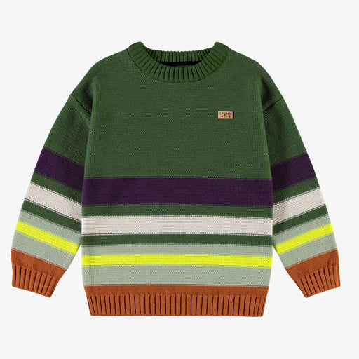 Souris MiniGreen dropped-shoulder knit sweater with round collar and a pattern that gives a handmade look with colourful stripes in shades of green, beige, ye...