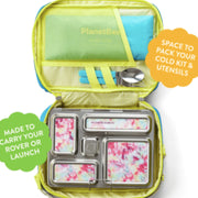 PlanetBox - Launch + Rover Carry Bag is made from 100% recycled polyester fibre and an easy-wipe main compartment. Built to carry Planetbox Launch and Rover lunchboxes, water bottle and additional containers or snacks for an easy grab-and-go as you're headed out the door.
