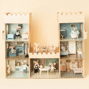 A beautiful castle for mice! Maileg Mice Castle comes in 3 pieces (Tower with Kitchen, Hall and Tower with Mirror) and is sold separately. It is made of sturdy cardboard covered in unique Maileg prints. On the ground floor, you find a small kitchen or space for a living room, and on the third floor, a small balcony. This amazing castle is designed specifically for big brother and sister mice, but smaller mice fit too.