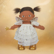 • Fairy Willow has magnets safely concealed in each of her hands so she can hold her wand, baby unicorn or fairy food • She comes dressed in a removable sparkly tulle dress with fixed velvet embroidered wings, a sparkly heart wand, frilly socks, cotton underwear and rose gold coloured shoes.