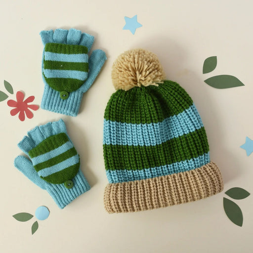 RockahulaThis Cozy Striped Knitted Green hat will keep you warm on all your fun winter adventures! Made in super soft yarn and topped with a neutral pom pom...