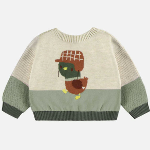 Souris MiniKnit Cardigan with Duck Illustration with green stripes at the bottom, a buttonhole with imitation wood buttons, ribbed knit wrists and waistband, ...