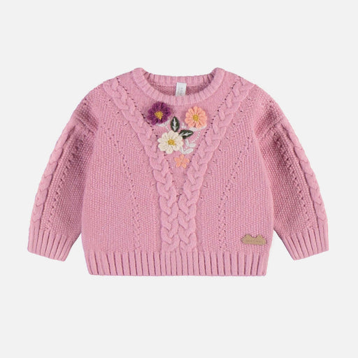 Souris MiniLilac Knitted Sweater with Flower Embroidery + Crochet is a long-sleeved raglan sweater with the front embroidered with small, colourful flowers, a...
