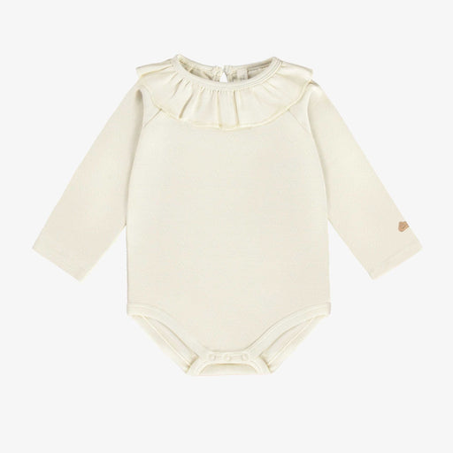 Souris MiniCream bodysuit with long raglan sleeves, round collar sublimated by a ruffle, 100% cotton stretch pointelle jersey ideal for sensitive skin. Small ...