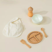 • Set includes: wooden divided plate, bowl, fork, spoon, sippy cup, bottle, pacifier, rattle, comb and cloth bib.