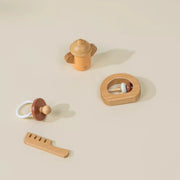 This Wooden Doll Accessories set is crafted for little caregivers to enhance their play experience. The set includes a bib, pacifier, bottle, sippy cup, feeding plate with utensils, and a rattle. Made from quality wood and built to last.