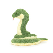 Cizi Snake is a statement-making serpent this festival season. Bright and bold in contrasting forest green and pale yellow fur, Cizi has soft textured scales, embroidered scutes detail, and a sweet, smiling face. Poised ready to strike for a cuddle, Cizi is showing off that suedette forked tongue.