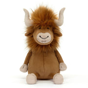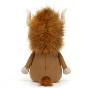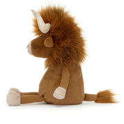 Ramone Bull has a wild mane of silky fur in ginger and charcoal. This sturdy bull has beige suedette horns, a cinnamon tum and a tassel tail. Ramone's got a huge stitched nougat nose and matching cloven hooves.