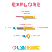 • The Explore Kit includes 50 pieces (1 x Safe-Saw, 1 x Scru-Driver; 36 x Scru (connects up to 3 layers), 12 x Scru+ (connects up to 5 layers), 1 x BONUS Mini-Tool). All packed in a handy carry and store toolbox.