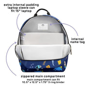 - Care: To clean, simply wipe the backpack with a damp cloth.